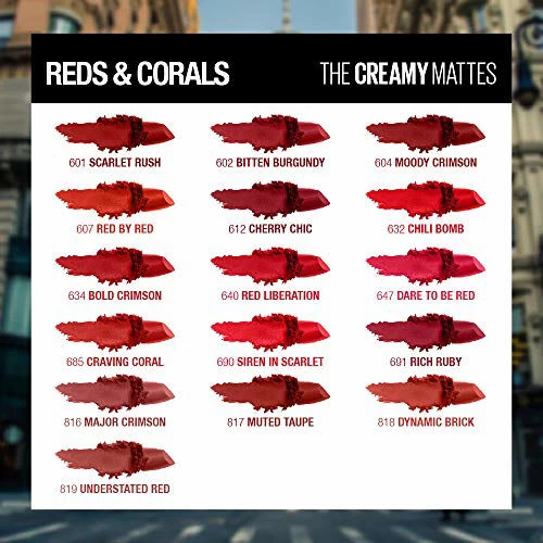 Discover creamy matte for bold impact! Achieve statement-making color with Maybelline New York?s Color Sensational Creamy Matte Lipstick in an instant. Infused with pure precious oils, our smoothest, creamiest, wearable, non-drying matte lipstick leaves the lips with a sensuous finish for a comfortable feel. Available in 20 different stunning pigmented lipstick color. Ranging from classic red lipsticks such as Rich Ruby and Siren in Scarlet to flawless nude lipsticks like Daringly Nude and Nude Embrace. Pair with one of our Color Sensational Shaping Lip Liners, which comes in a variety of shades that match your favorite lipstick to define, line and fill for a perfect lip look.