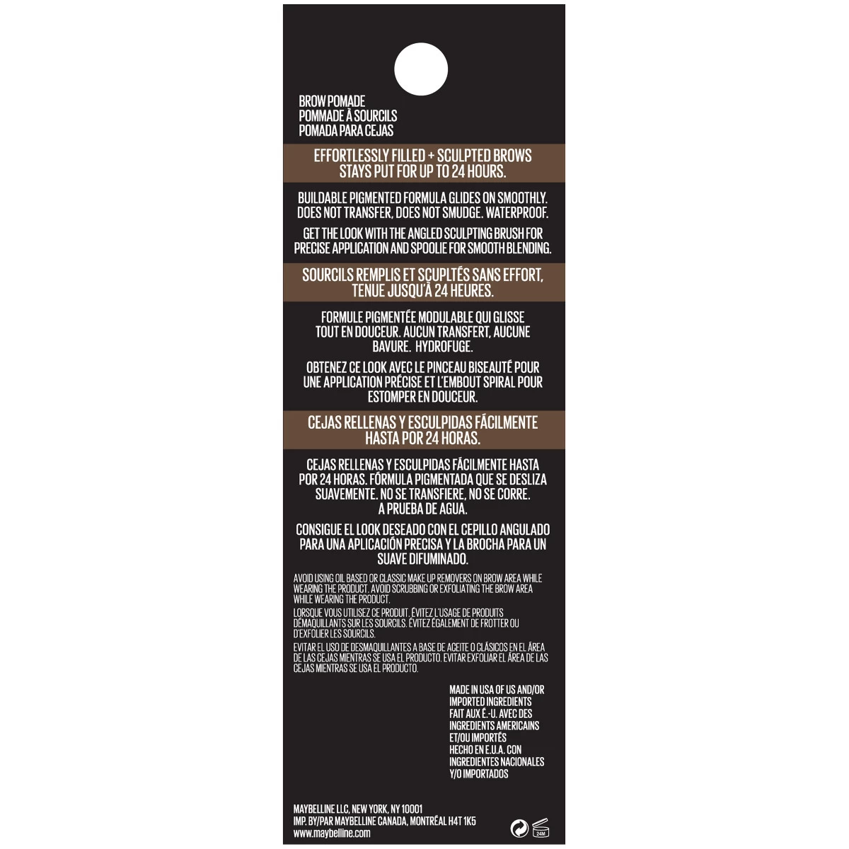 Achieve the look of full, sculpted, and natural-looking eyebrows in three easy steps: outline, fill in with buildable coverage and blend. It’s designed to perfectly match the color of your brows and is formulated for long-lasting, waterproof wear. Maybelline’s matte pomade glides on for an evenly filled in effect. The dual-ended applicator gives you the ultimate control with its angled sculpting brush and spoolie for natural shading and blending. This long-lasting formula does not smudge and does not transfer for fool-proof wear that lasts for 24 hours.